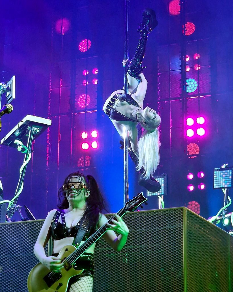 For Ich hasse Kinder, he wore the chestpiece with breasts again (the piece even showed up in the official tour photo of bands and crew, although he was not the one wearing it there), and he did another little dance around Brynn’s pole, which was hilarious. The only sad thing was that the lighting on the platform was difficult, so I wasn’t able to properly capture his pole dance. I still loved it!