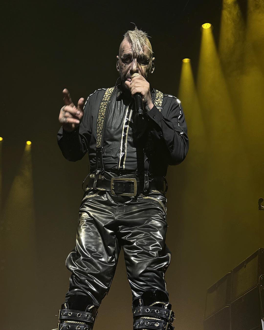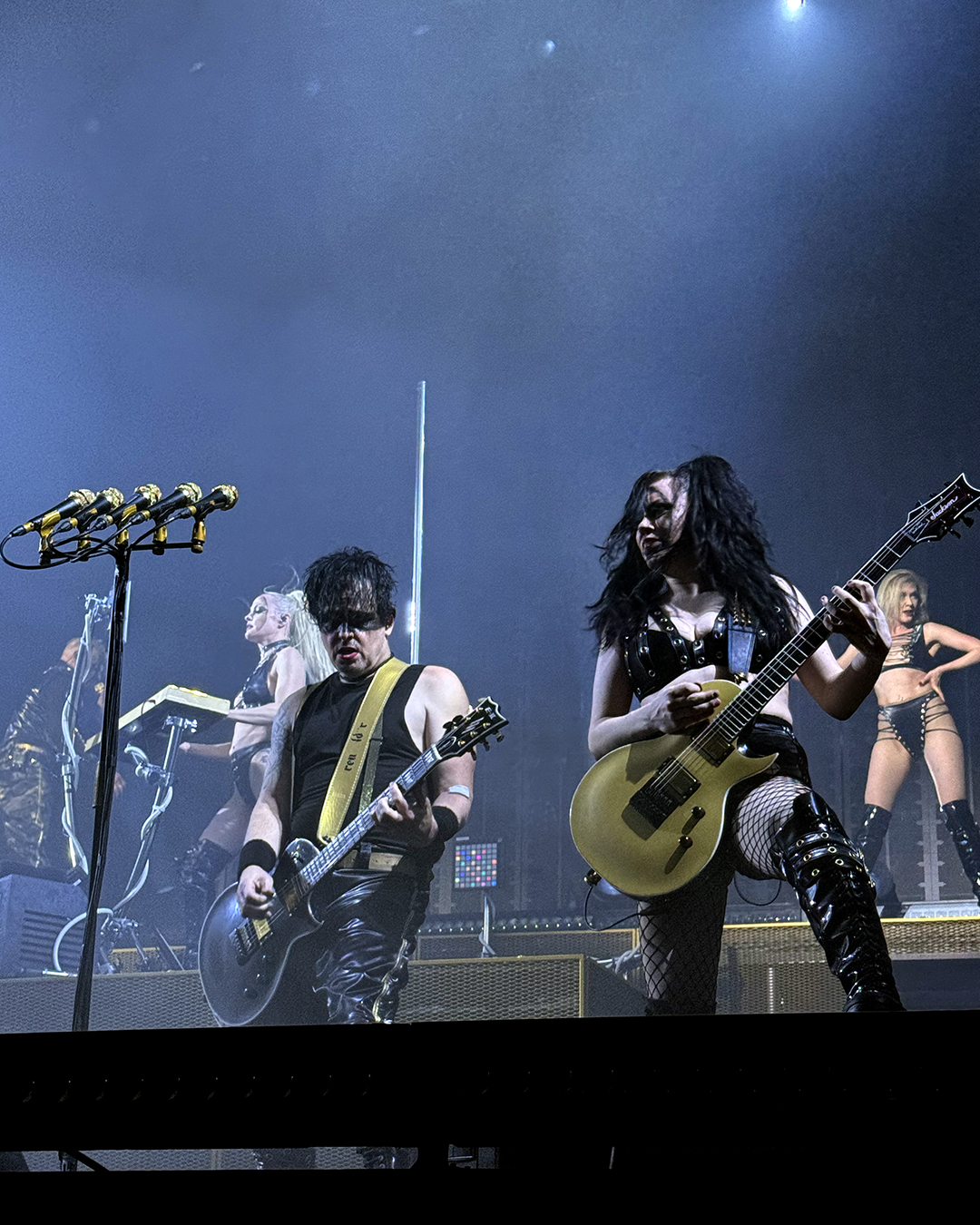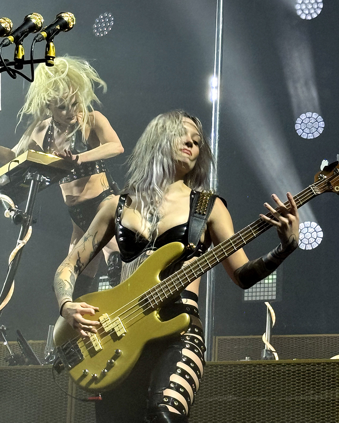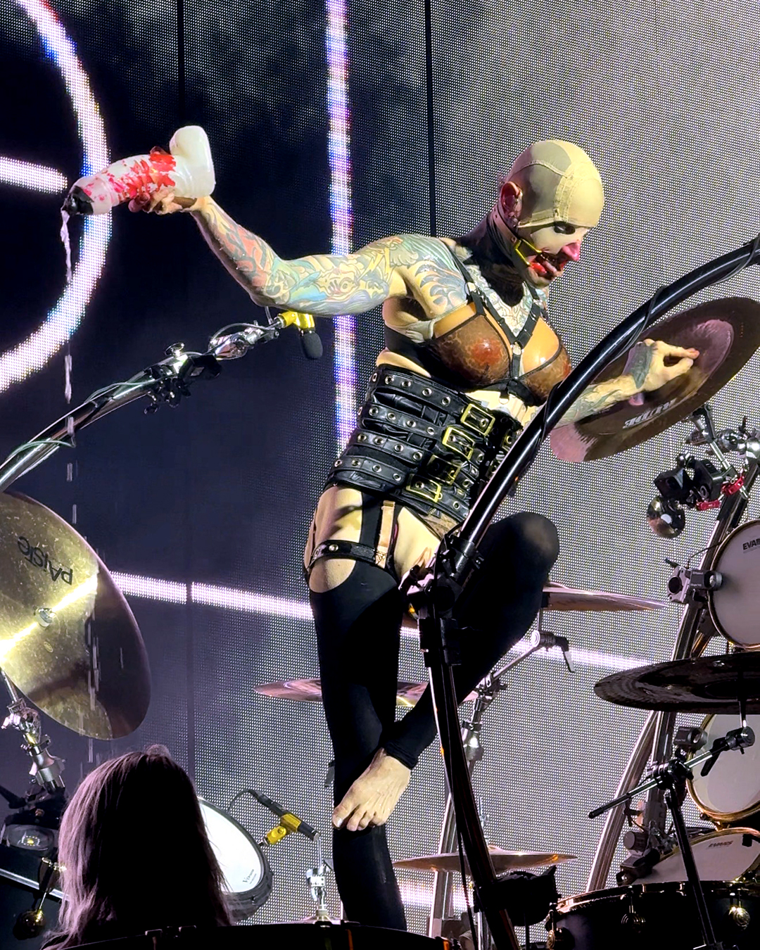 For Ich hasse Kinder, he wore the chestpiece with breasts again (the piece even showed up in the official tour photo of bands and crew, although he was not the one wearing it there), and he did another little dance around Brynn’s pole, which was hilarious. The only sad thing was that the lighting on the platform was difficult, so I wasn’t able to properly capture his pole dance. I still loved it!