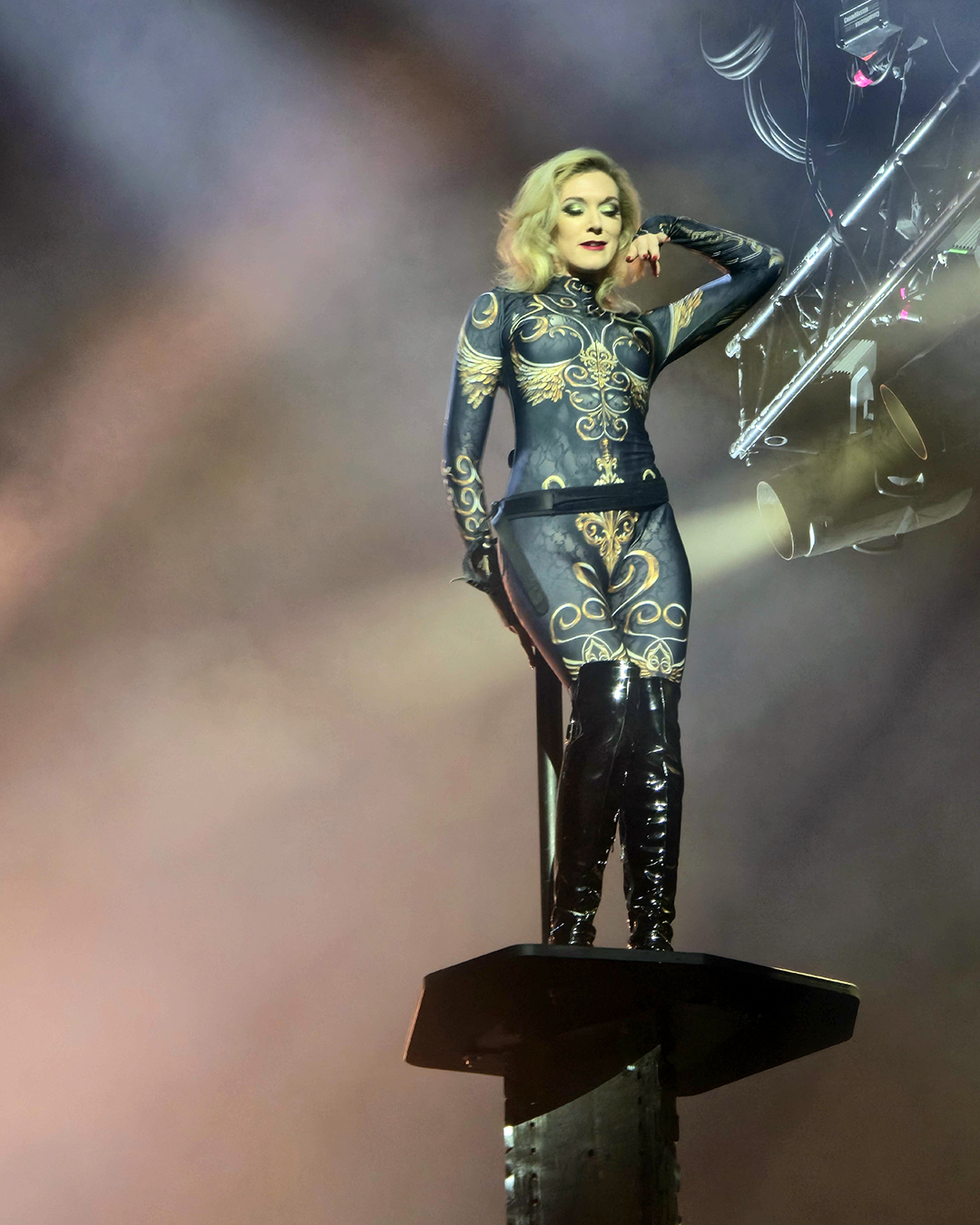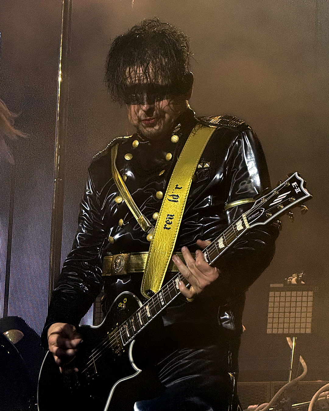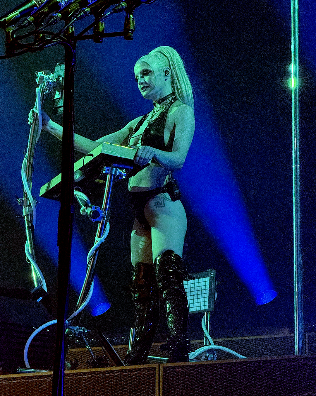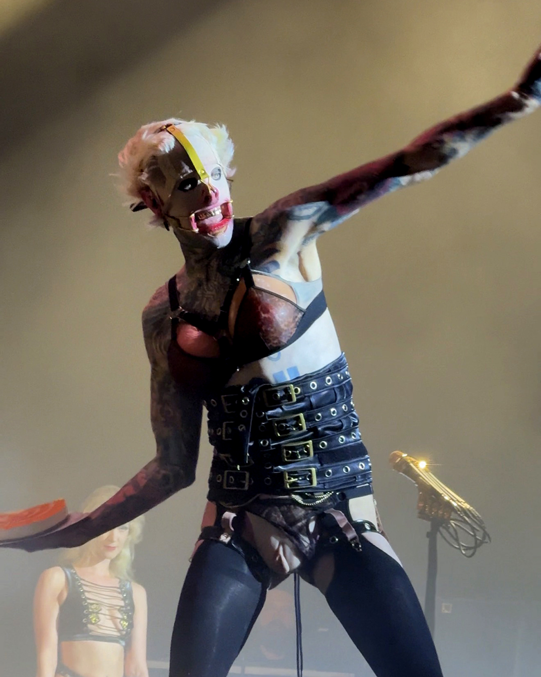 For Ich hasse Kinder, he wore the chestpiece with breasts again (the piece even showed up in the official tour photo of bands and crew, although he was not the one wearing it there), and he did another little dance around Brynn’s pole, which was hilarious. The only sad thing was that the lighting on the platform was difficult, so I wasn’t able to properly capture his pole dance. I still loved it!