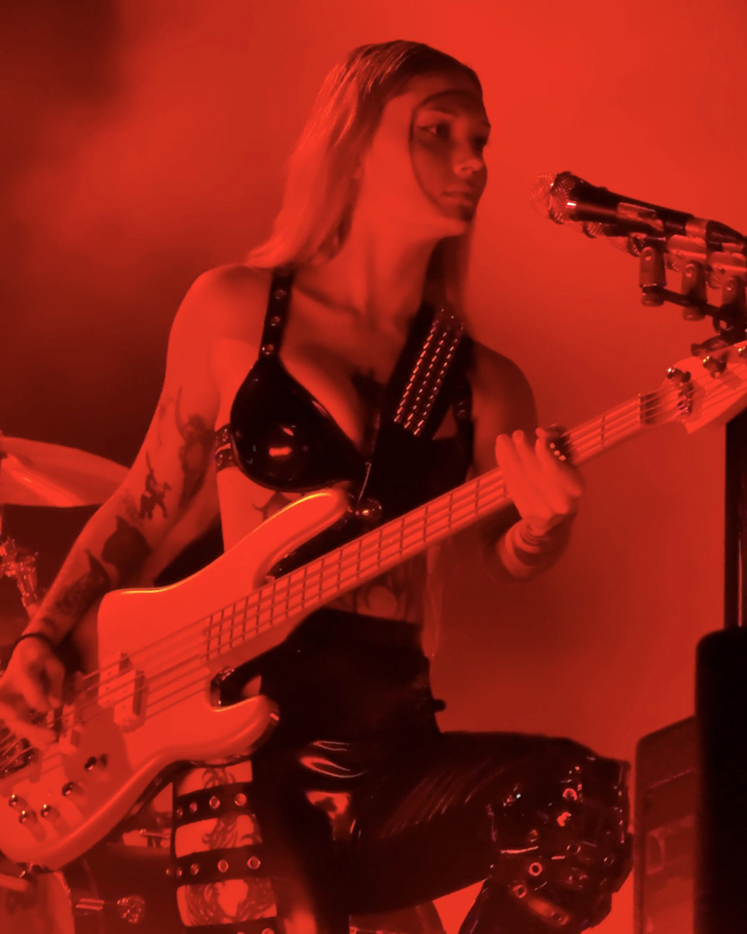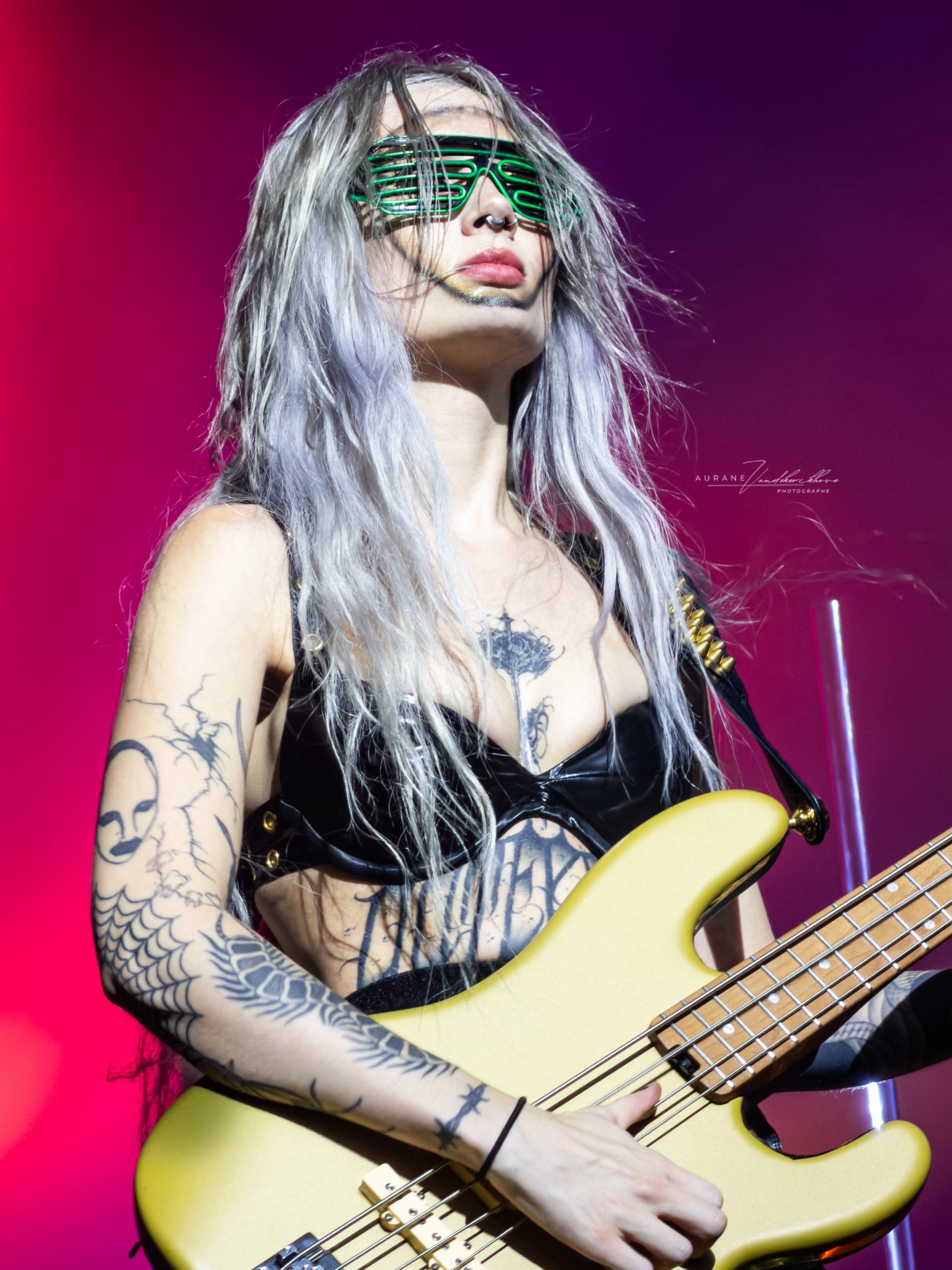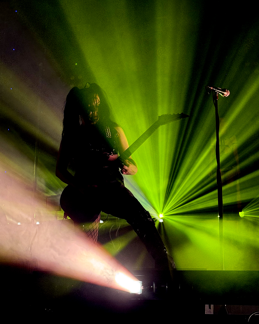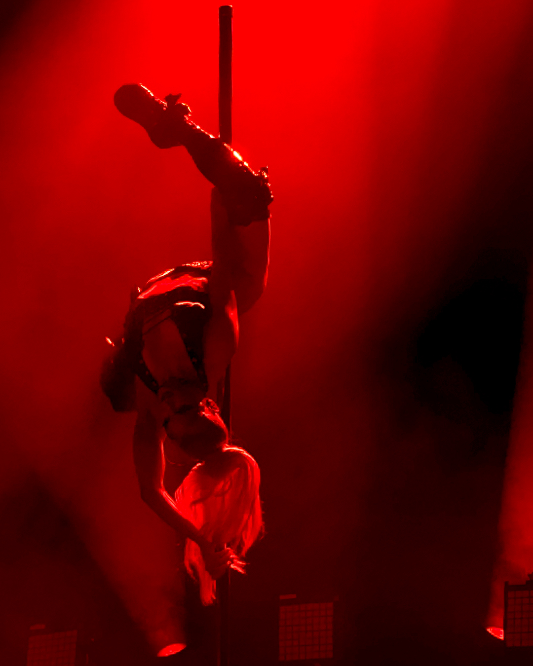 For Ich hasse Kinder, he wore the chestpiece with breasts again (the piece even showed up in the official tour photo of bands and crew, although he was not the one wearing it there), and he did another little dance around Brynn’s pole, which was hilarious. The only sad thing was that the lighting on the platform was difficult, so I wasn’t able to properly capture his pole dance. I still loved it!