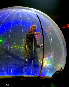 We were standing in the first row on the left, right next to the exit from which the plastic ball comes out. Due to the shape of the hall and the stage setup, the area of the first row was not very wide, and we therefore had a fantastic view of the stage.